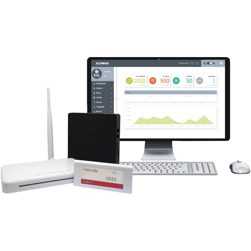 Sistem ESL dilengkapi dengan master host, coordinator base station dan berbagai label harga elektronik ESL.